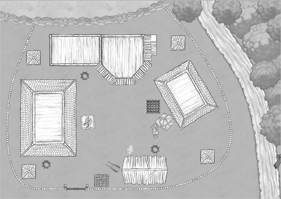 Das Banditenlager ist in einem Wald gelegen. Geschützt wird das Lager durch einen umgebenen Palisadenzaun und vier Wachtürmen. Im Norden liegt das Lager an einer Steinwand und im Osten an einem Fluss. Somit ist eine Grundversorgung mit Wasser und Nahrung gegeben. Ein idealer Ort von dem man entsprechende Raubzüge planen kann.