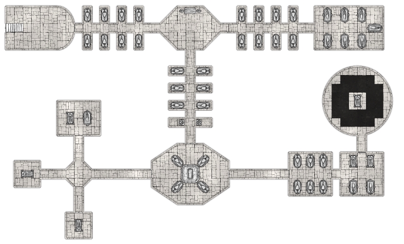 Ein kleines und übersichtliches Mausoleum. Dieses kann mit Untoten und Fallen gespickt sein und den ein oder anderen Schatz enthalten. Der runde Raum sollte eigentlich auch eine runde Fallgrube um den Sarg haben, aber das ist mit nicht so ganz gelungen und sieht hier eckig aus.